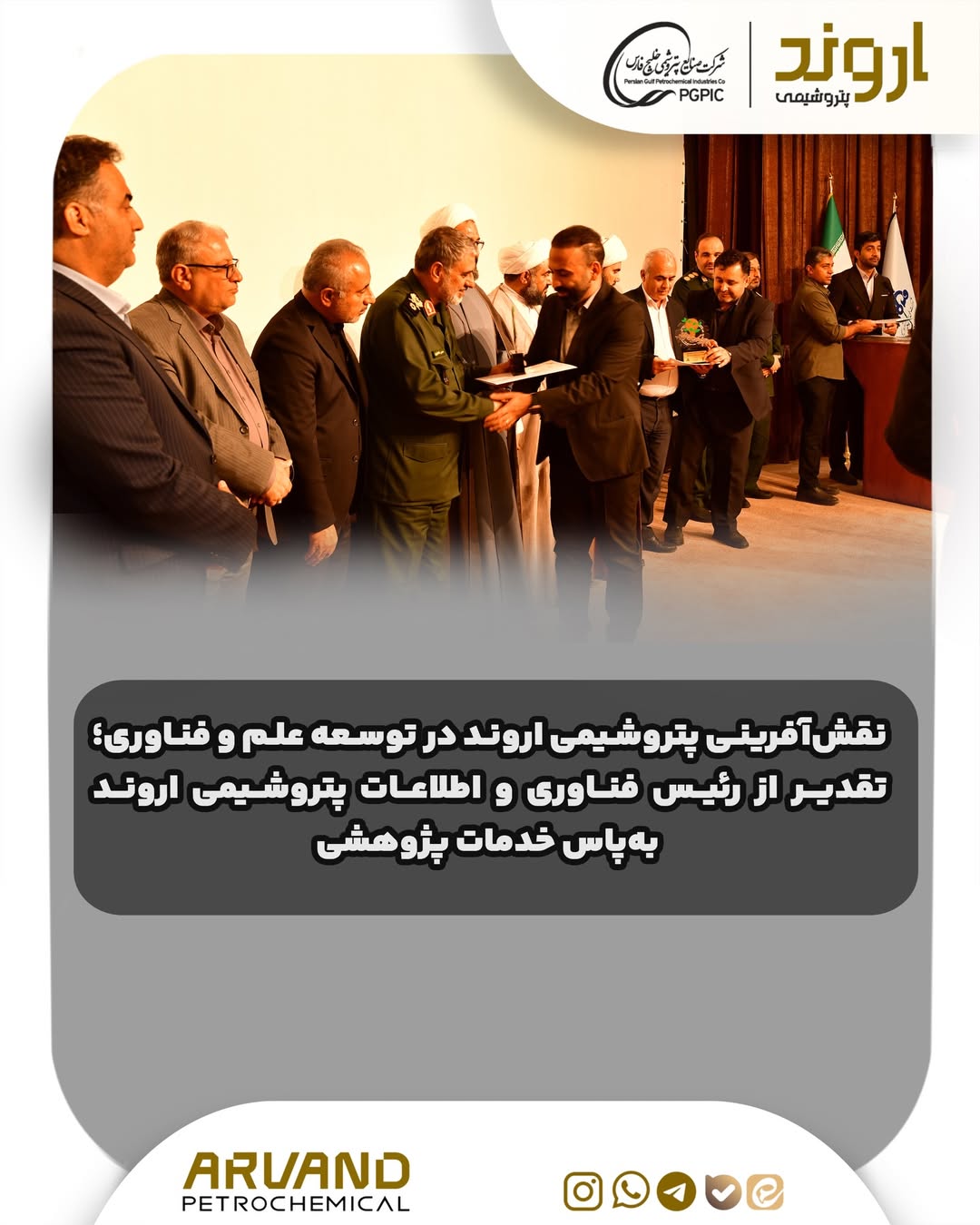 🔹در متن لوح سپاس که به رئیس فناوری و اطلاعات پتروشیمی اروند اهدا شد، بر اهمیت پژوهش و فناوری بهعنوان بنیان اقتدار ملی و توسعه پایدار و نقش نخبگان در ترسیم آینده روشن کشور تأکید شده است.