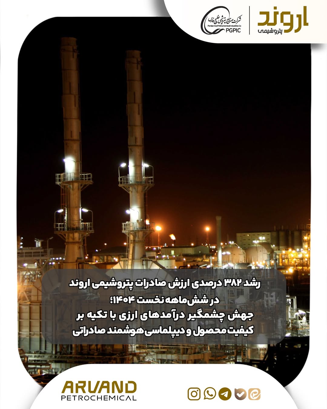 همزمان با روز ملی صادرات، تازهترین گزارش عملکرد شرکت پتروشیمی اروند نشان میدهد که ارزش فروش صادراتی محصولات این شرکت در ششماهه نخست سال ۱۴۰۴ با رشد ۳۸۲ درصدی نسبت به مدت مشابه سال گذشته رسیده است.