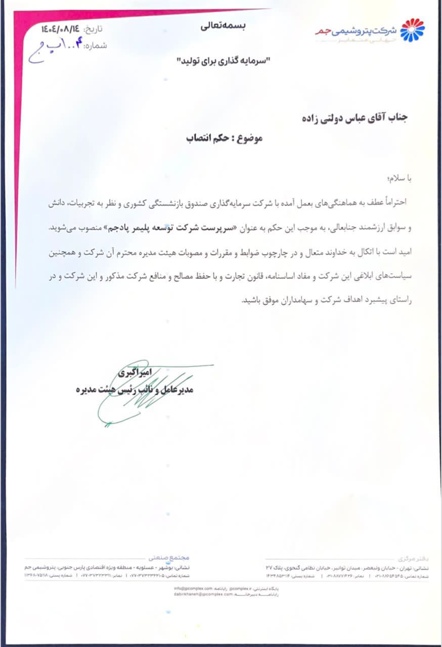 ⭕ وضعیت مدیریتی پادجم» تعیین تکلیف شد/ «عباس دولتیزاده» سرپرست پتروشیمی «پادجم» شد